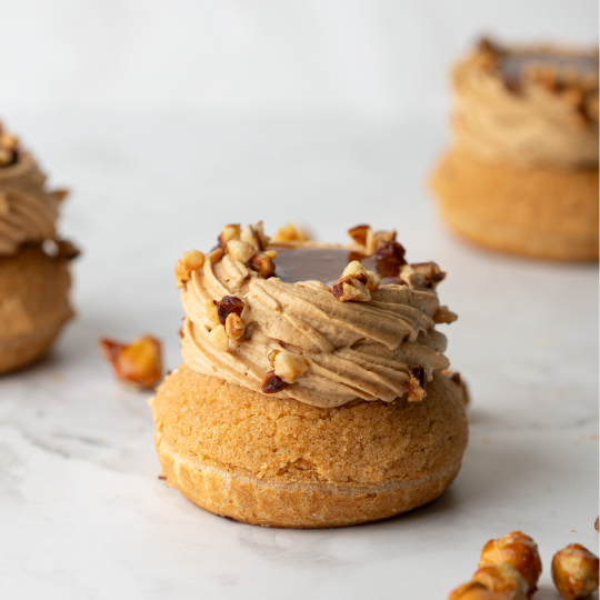 Pâte à choux craquelin, garnit avec une Crème au Praliné et un cœur coulant au Praliné